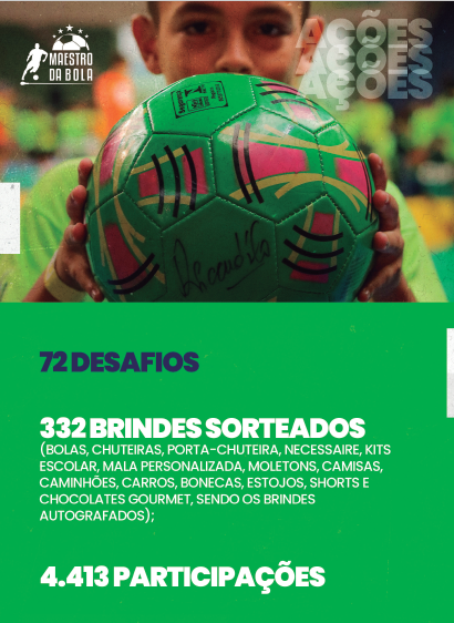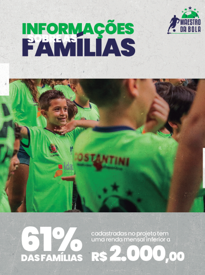 Projeto Maestro da Bola SOCIAL consiste em, juntamente com a prefeitura, oferecer atividades gratuitas na modalidade de futebol/futsal para crianças e adolescentes de 07 a 14 anos, prioritariamente matriculados na Rede de ensino Pública;